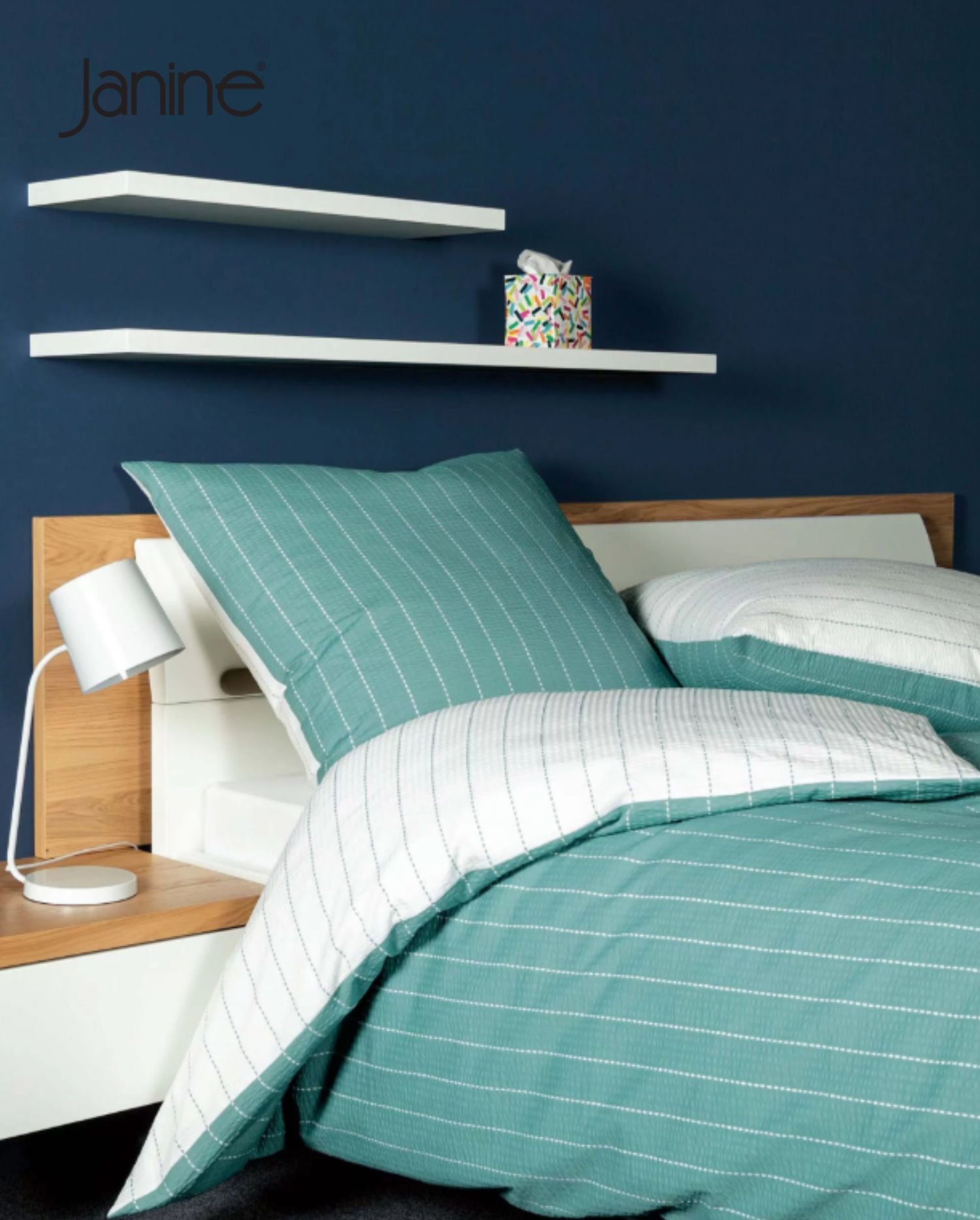 Frisch, modern und hautsympathisch: Die Janine Mako-Soft-Seersucker Wendebettwäsche „Tango“ bringt einen Hauch von Eleganz in dein Schlafzimmer. Das dezente Streifenmuster in mineralgrün trifft auf eine helle Rückseite – so entscheidest du je nach Stimmung, welche Seite den Ton angibt.