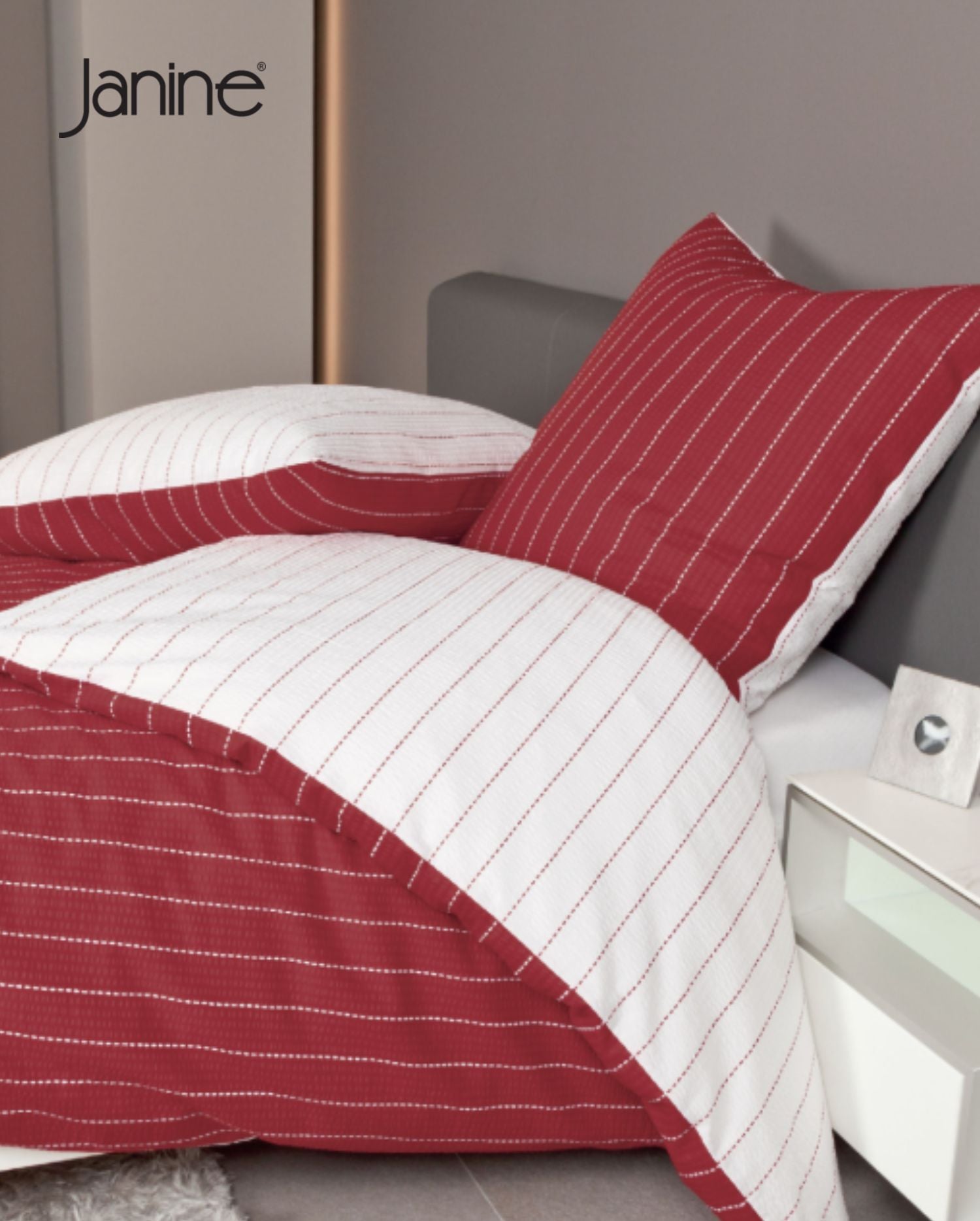 Klassisch, edel und hochwertig: Die Janine Mako-Soft-Seersucker Wendebettwäsche „Tango“ in Bordeaux setzt stilvolle Akzente. Das feine Streifenmuster in Dunkelrot und Weiß wirkt elegant, während die Wendeseite in umgekehrter Farbstellung dezente Abwechslung bietet.